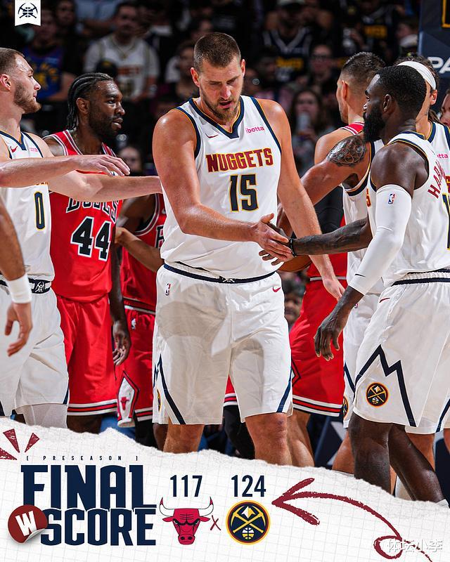 北京时间10月15日,NBA季前赛继续进行,掘金队对阵公牛队。两支球队都是主力球员。掘金占据场上主动,进攻状态十分火热。半场比赛他们拿下67分,领先12分。下半场,掘金队进一步扩大分差,领先优势多达24分。他们在最后一节更换了替补球员。末节掘金突然失误,打出一波20-4的进攻高潮。幸运的是,他们在前面有很大的领先优势。最终,掘金队以124-117击败公牛队。季前赛结束后,各支球队都会让自己的主力球员留在场上,争取更多的时间,以提早适应常规赛的节奏。这段时间在掘金队,约基奇和穆雷并肩作战。他们一开始也有出色的表现,帮助球队占据主动,随后他们也在场上充分占据主动,不断开拓进取。找到分差,领先优势达到24分。末节替补球员对决中,掘金突然出现失误,被对手发起20-4的攻势缩小分差。好在时间所剩无几,最终掘金赢得了比赛。由于主力球员在场上比赛的时间较长,所以这场比赛非常激烈。裁判直接吹罚了多达60次犯规,其中公牛队32次,掘金队28次。约基奇在24分钟内犯规4次。不断的犯规也让球员多次走上罚球线。全场比赛罚球69次,其中掘金队罚球41球,公牛队罚球28球。