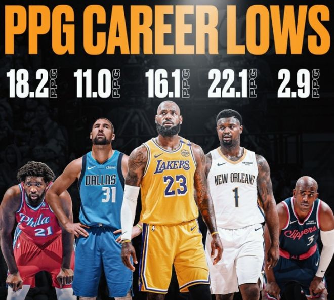 NBA新时代至今争夺激烈,不少老牌巨星和“玻璃人”球星都创下了职业生涯得分新纪录。即将年满41岁的詹姆斯本赛季场均得分仅为16.1分,而恩比德的场均得分则下降至18.2分。两人职业生涯首次单赛季得分低于20分。保罗场均仅得到2.9分,并与快船队分道扬镳。克莱场均只有11分,锡安场均22.1分,双双下滑。詹姆斯:场均16.1分。詹姆斯因为坐骨神经痛缺席了新赛季前14场比赛,之后又时不时地反弹。湖人新赛季前23场比赛,詹姆斯只出战7场,场均拉罗出场33.1分钟,创下职业生涯新低纪录。詹姆斯场均仅得到16.1分、4.7个篮板和7.6次助攻。他职业生涯第一次场均得分低于20分。他场均得到24.4分上赛季的比赛。恩比德:场均18.2分。本赛季前23场比赛,恩比德因伤缺席14场比赛,场均贡献18.2分5.6篮板3助攻,创下职业生涯单赛季得分最低纪录。这也是他职业生涯第一次单赛季场均得分低于20分。恩比德正在逐渐失去76人队顶级球星的地位,现在舆论普遍认为马克西才是球队的顶级球星。保罗:场均2.9分,40岁保罗崩溃了。本赛季他场均仅得到2.9分,创下职业生涯新低。目前,保罗与快船已经“分道扬镳”。保罗表示,他仍然想贡献剩余的金额,但仍然不知道他会加入哪支球队,以及是否还有球队想要他。克莱:场均11分的克莱被放在了小牛队的交易桌上。目前,小牛队的战绩仅为9胜1负。6 损失。球队已经开始交易浓眉哥、拉塞尔和克莱等球员,并准备围绕状元弗拉格开始重建模式。但克莱本赛季继续下滑,场均仅得到11分,创职业生涯新低。他的不稳定导致他的交易价值直线下降。 锡永:场均22.1分。尽管本赛季锡安体重明显减轻,但他的健康问题仍然不好。鹈鹕队前25场比赛,仅取得3胜22负,排名西部垫底。锡安因伤缺席了15场比赛。他场均贡献22.1分5.6篮板4助攻1.6抢断,这仍然是他职业生涯单赛季的最低得分纪录。此前,他在新秀赛季场均得到22.5分,锡安也被放在了鹈鹕队的交易桌上。 (文/醉卧福生)