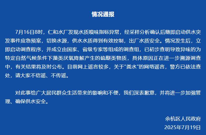 7月19日中国新闻服务。根据有关Yuhang的《 Yuhang的公共帐户》发表的新闻,杭州的Yuhang地区政府于7月19日发出了通知,内容是关于Renhe Street和Liangzhu Street的某些地区的不寻常的水闻。